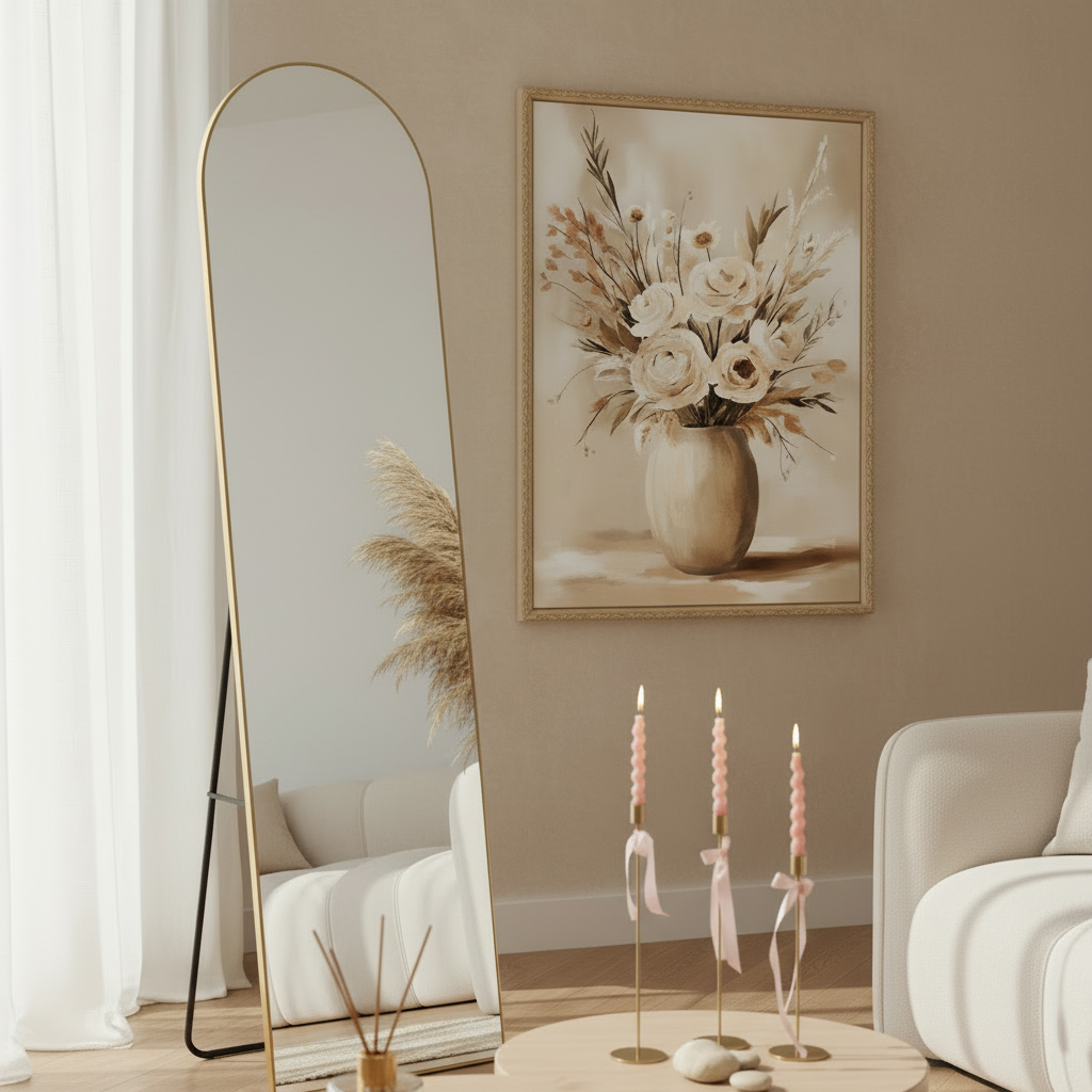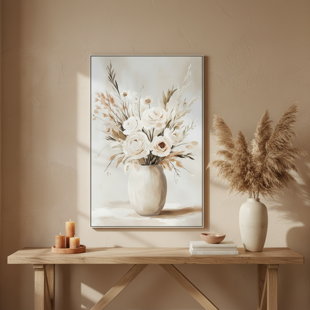 Αναβαθμίστε τον χώρο σας με αυτόν τον κομψό πίνακα καμβά σε αποχρώσεις εκρού και καφέ, που απεικονίζει ένα βάζο με λουλούδια. Συνδυάζει εκτύπωση σε καμβά με 50% χειροποίητη ζωγραφική για μοναδική υφή και βάθος. Ιδανικός για σαλόνι, τραπεζαρία ή επαγγελματικό χώρο, χαρίζοντας φυσική αρμονία και ζεστασιά στη διακόσμηση.
